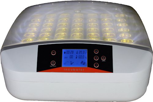 Вместительный инкубатор на 56 яиц с прозрачной верхней панелью и встроенной светодиодной подсветкой. Оснащен микрокомпьютером, который автоматически управляет всеми процессами: поддерживает необходимую температуру и влажность (при превышении заданных параметров включается тревожный сигнал), а также переворачивает яйца. Питается от сети 220 В.