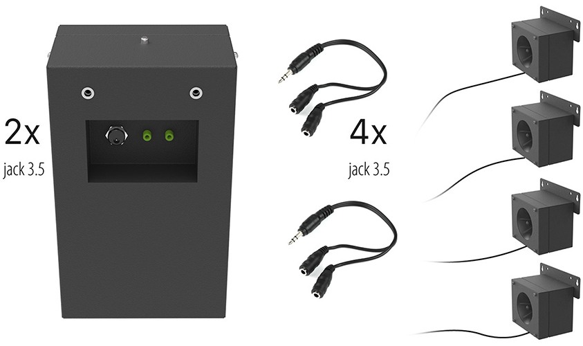 Отпугиватель птиц "Град А-16" обладает только одним аудиоразъемом, поэтому для подключения 4 динамиков к нему потребуется три переходника.